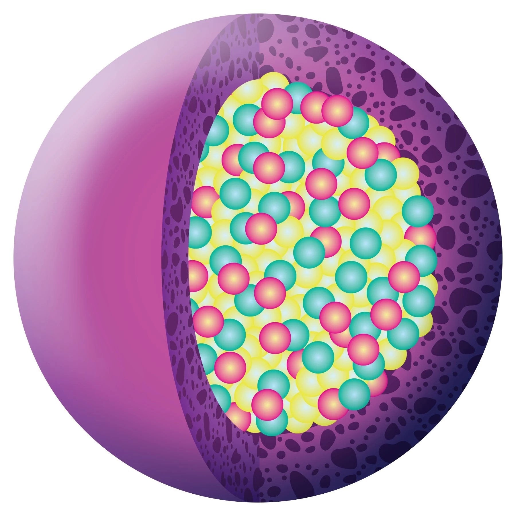 6. Enable consecutive delivery. Encapsulating multiple active ingredients inside one microsphere, one ingredient is encapsulated in the core, and another is encapsulated separately in the shell. The release can be consecutive; the first ingredient is released from the shell following the release of the other components from the core. Examples of multiple successive releases are MultiSal® Flavor/Cooling and MultiSal® MultiLayer antiaging.