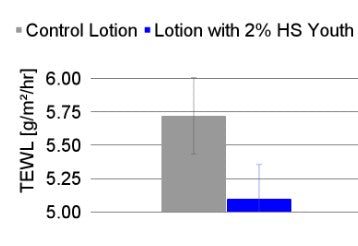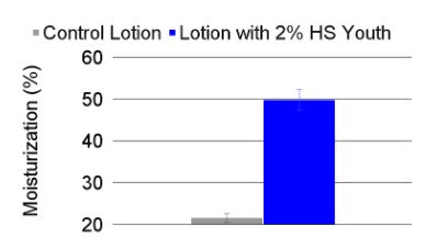 Copper Tripeptide, stabilized in a hydrophobic ceramide core, binds effectively to the skin to stimulate collagen and elastin. Resveratrol provides antioxidant protection, while low molecular weight HA and ceramides reinforce the barrier and prolong hydration. This targeted delivery system improves efficacy against wrinkles, sagging, and lost elasticity. Clinical studies show that HydroSal® Youth significantly improves the fine lines and wrinkles of crow’s feet.